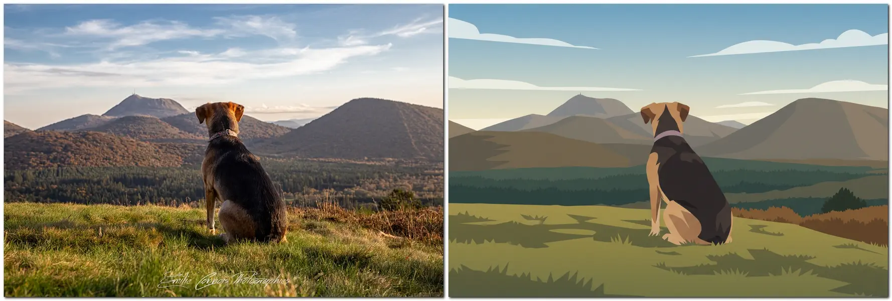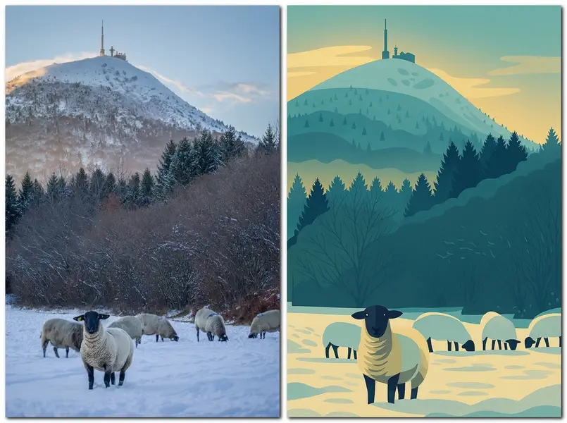 Chaque « photo dessinée » débute par une photographie réelle prise en Auvergne : volcans, panoramas, points de vue emblématiques ou lieux chargés de sens.